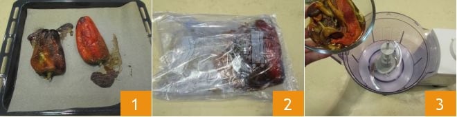 Um die Bigoli in roter Paprikasauce zu kochen, beginnen Sie mit der Zubereitung der Sauce. Waschen und trocknen Sie die roten Paprika, legen Sie sie auf ein mit Backpapier ausgelegtes Backblech und backen Sie sie im vorgeheizten, statischen Ofen bei 250 °C für etwa 25 Minuten. Drehen Sie die Paprika gelegentlich, bis Sie sehen, dass die Haut trocknet und sich vom Fruchtfleisch zu lösen beginnt 1. Wenn die Haut beginnt, sich vom Fruchtfleisch zu lösen, nehmen Sie die Paprika aus dem Ofen und legen Sie sie in einen Lebensmittelbeutel 2. Schließen Sie den Beutel und lassen Sie die Paprika schwitzen, bis sie lauwarm sind. Jetzt können Sie die Haut von den Paprika entfernen. Nachdem Sie dies getan haben, schneiden Sie die Paprika in zwei Hälften, entfernen Sie den grünen Stiel außen, die weißen Fasern und auch die inneren Kerne. Geben Sie das so erhaltene Paprikafleisch in den Behälter eines Mixers 3.