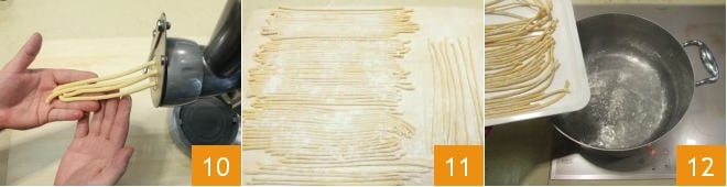 Der so erhaltene Teig muss mindestens 30 Minuten bei Raumtemperatur ruhen. Nach den 30 Minuten Ruhezeit nehmen Sie den Teig und teilen ihn in kleinere Stücke. Geben Sie ein Stück des Teigs in den Behälter der speziellen Maschine zur Herstellung von Bigoli. Betätigen Sie die Maschine und erstellen Sie die Bigoli 10. Legen Sie die so erhaltenen Bigoli auf ein bemehltes Brett, damit sie nicht kleben 11. Wiederholen Sie den Vorgang für alle Teigstücke. Fahren Sie nun mit dem Kochen der Bigoli fort. Kochen Sie sie in reichlich Salzwasser 12.