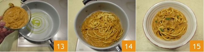 Erhitzen Sie nun in einer Pfanne, nachdem Sie diese mit einem Schuss Öl bestrichen haben, die Paprikasauce 13. Lassen Sie dann die Bigoli gut abtropfen und vermengen Sie sie mit der Paprikasauce 14. Fügen Sie den letzten Schliff hinzu: Verwenden Sie Majoranblätter, um Ihre Bigoli in roter Paprikasauce zu dekorieren. Servieren Sie die Bigoli in roter Paprikasauce heiß 15.