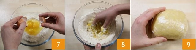 Machen Sie nun mit der Zubereitung der frischen Pasta weiter. In einer Schüssel das gesiebte Mehl eingeben. Formen Sie das Mehl zu einem Brunnen und geben Sie in die Mitte die Eier 7 und eine Prise Salz. Beginnen Sie, die Eier mit dem Mehl zu vermischen und integrieren Sie nach und nach das Mehl in die Eier 8. Wenn Eier und Mehl gut vermischt sind, kneten Sie den Teig kräftig mit den Händen für mindestens 10 Minuten. Sie müssen einen weichen und homogenen Teig erhalten, dem Sie die Form einer Kugel geben. Wickeln Sie dann Ihre Teigkugel in Folie 9.