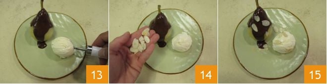 Platzieren Sie daneben eine Kugel Eis 13 und bedecken Sie die Birne mit Mandelblättchen 14. Servieren Sie sofort Ihre Birnen Helene 15!