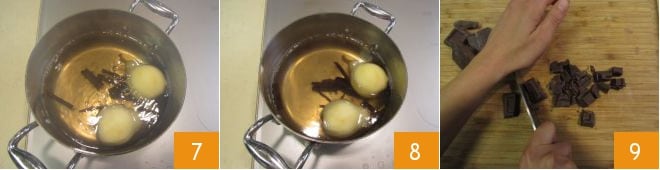 Kochen Sie sie 25 Minuten bei mittlerer Hitze 7. Sie sollten weich, aber noch fest sein. Lassen Sie sie anschließend in ihrem Kochwasser abkühlen. In der Zwischenzeit hacken Sie die Zartbitterschokolade 9