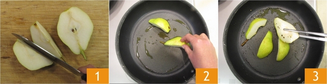 Um die Birnen mit Speck und Trockenfr fcchten zuzubereiten, wascht zuerst die Birne und schneidet sie in 4 Spalten 1, entfernt dann das Kerngeh e4use. Erhitzt einen Schuss d6l in einer Pfanne, gebt die Birnenspalten hinzu 2 und bratet sie bei mittlerer bis hoher Hitze von beiden Seiten f fcr ein paar Minuten 3. Mit Salz und Pfeffer w fcrzen.