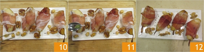Richtet das Gericht mit den karamellisierten Trockenfr fcchten 10 und dem gehackten Rosmarin 11 an. Eure Birnen mit Speck und Trockenfr fcchten sind bereit, noch warm serviert zu werden 12!