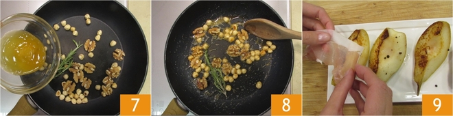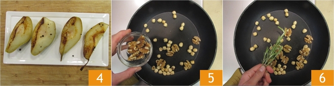 Sobald sie goldbraun sind, nehmt die Pfanne vom Herd und stellt die Birnen beiseite, haltet sie warm 4. Gebt die gemischten Trockenfr fcchte in eine andere Pfanne 5 und f fcgt den Rosmarin hinzu 6.