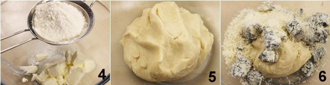 Nun fahren Sie mit dem Teig fort: Geben Sie in eine Schüssel (oder auf eine Arbeitsfläche) das gesiebte Mehl, die bei Raumtemperatur weich gewordene Butter 4, das Backpulver, Salz und Pfeffer und kneten Sie, bis Sie einen glatten Teig erhalten 5. An diesem Punkt fügen Sie den Gorgonzola und den geriebenen Parmesan hinzu 6 und kneten Sie, um die Zutaten gut zu vermischen.