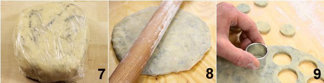 Formen Sie aus dem Teig einen Laib, wickeln Sie ihn in Frischhaltefolie und legen Sie ihn für etwa eine halbe Stunde in den Kühlschrank 8. Nach der Ruhezeit rollen Sie den Laib mit einem Nudelholz auf einer bemehlten Arbeitsfläche aus und bilden einen etwa 1 cm dicken Teig 8. Schneiden Sie nun mit einem runden Ausstecher von etwa 3 cm Durchmesser die Kekse aus 9 und legen Sie sie auf ein mit Backpapier ausgelegtes Backblech. Bestreichen Sie die Oberflächen der Kekse mit Sahne und bestreuen Sie sie mit den gehackten Walnüssen und Sesamsamen. Schließlich im vorgeheizten Ofen bei 180 Grad für etwa 20 Minuten backen. Nehmen Sie die Mürbeteigkekse aus dem Ofen und lassen Sie sie auf einem Gitter auskühlen.