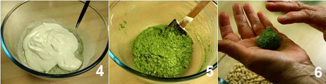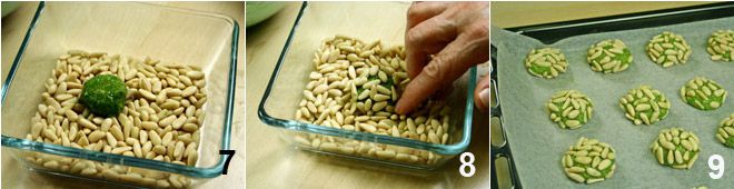 Wälzen Sie die so geformten Kugeln in einem Behälter, in dem Sie die Pinienkerne platziert haben (7-8). Legen Sie die Kekse auf ein mit Backpapier ausgelegtes Blech 9 und lassen Sie die Matcha-Tee-Kekse im vorgeheizten Ofen etwa 15 Minuten bei 170 Grad backen.