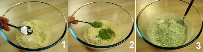 Der erste Schritt zur Zubereitung der „Zwei-Uhren“-Kekse besteht darin, das Eiweiß mit der Hälfte des Zuckers steif zu schlagen. Dann die gerösteten Mandeln in einem Mixer fein hacken 1, in eine Schüssel geben und mit dem restlichen Zucker vermischen. Die Samen einer Vanilleschote und den Matcha-Tee hinzufügen 2, mischen 3 und das steif geschlagene Eiweiß hinzufügen 4.