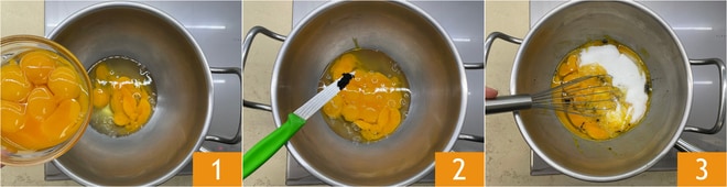 Um den Biskuit mit Chantilly und Waldfrüchten zuzubereiten, arbeiten Sie Eier und Eigelb 1 mit Vanille 2, Salz und Zucker 3.