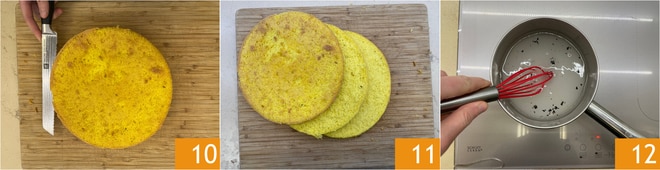Sobald es aus der Form genommen und abgekühlt ist, entfernen Sie die Unregelmäßigkeiten an der Oberfläche 10, dann in 3 Scheiben teilen 11. Bereiten Sie die Tränke zu, indem Sie in einem kleinen Topf Wasser, Zucker und die Samen der Schote mischen 12, rühren und zum Kochen bringen, dann ausschalten und abkühlen lassen.