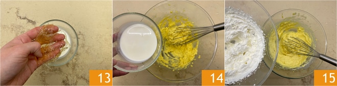 Legen Sie die Gelatine in kaltes Wasser zum Einweichen für etwa 10 Minuten, dann lösen Sie sie in wenig lauwarmer Milch auf 13, entnommen von der Menge, die zum Erwärmen benötigt wird, um 350 g Konditorcreme herzustellen. Bereiten Sie die Konditorcreme auf klassische Weise zu, dann lassen Sie sie abkühlen. Fügen Sie der Creme die lauwarme Milch hinzu, in der Sie die Gelatine aufgelöst haben 14, mischen und vollständig abkühlen lassen. Fügen Sie der kalten Creme die geschlagene Sahne hinzu 15.