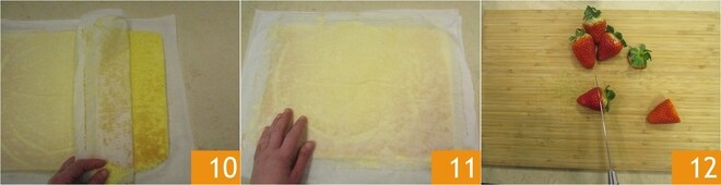 Glätten Sie die Oberfläche mit einer kleinen Palette 7 und backen Sie sie im vorgeheizten statischen Ofen bei 220° für 8-10 Minuten, bis die Oberfläche goldbraun ist und der Teig durchgebacken ist 8. Natürlich je nach Ofen, es kann weniger Minuten oder eine niedrigere Temperatur benötigen, wenn er sehr leistungsstark ist. In der Zwischenzeit bereiten Sie ein Blatt Backpapier vor und legen es auf die Arbeitsfläche. Sobald Sie den Biskuitteig aus dem Ofen nehmen, müssen Sie ihn auf das Backpapier stürzen 9, so bleibt er feucht.