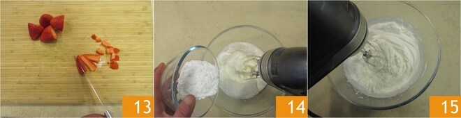 Schneiden Sie sie zunächst in Scheiben und dann in Würfel 13. Gießen Sie die kalte frische Sahne in eine Schüssel; beginnen Sie, sie mit den elektrischen Schneebesen aufzuschlagen und fügen Sie langsam den Puderzucker hinzu 14. Schlagen Sie weiter, bis Sie eine feste, aber nicht zu steife Sahne erhalten 15.
