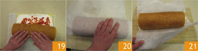 Rollen Sie sie vorsichtig straff 19 und achten Sie darauf, dass der Verschluss der Rolle unten ist 20. Wickeln Sie sie erneut in das Backpapier 20 und stellen Sie sie für 30 Minuten in den Kühlschrank. Nehmen Sie dann die Rolle heraus und packen Sie sie aus 21.
