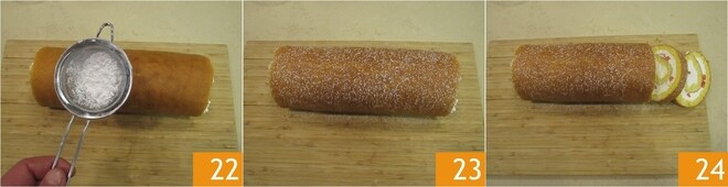 Bestreuen Sie sie mit Puderzucker 22, falls nötig, schneiden Sie die Enden ab 23, dann schneiden Sie sie in Scheiben und servieren Sie sie 24!