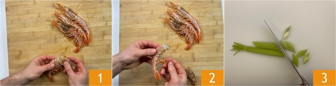 Um die Bisque vorzubereiten, bereiten Sie zuerst den Krustentierfond nach unserem Rezept zu. Reinigen Sie die Garnelen. Trennen Sie vorsichtig mit den Händen den Kopf 1, die Beinchen 2 und den Panzer. Sammeln Sie alle Abfälle in einer Schüssel, für diese Zubereitung benötigen Sie etwa 500 g. Um die Bisque zuzubereiten, sind nicht alle Garnelen notwendig, die Sie reinigen, 3-4 pro Person reichen aus, die anderen können Sie für Ihre Rezepte verwenden. Bereiten Sie also das Soffritto zu, reinigen Sie den Sellerie gut und schneiden Sie ihn in Streifen 3.
