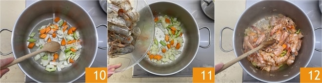 Rühren Sie um, um Geschmack zu verleihen 10, dann fügen Sie die Panzerabfälle hinzu 11 und erhöhen Sie die Hitze. Gelegentlich umrühren, es sollte sich eine Kruste am Boden bilden 12.