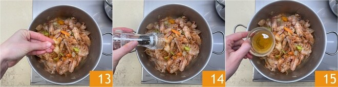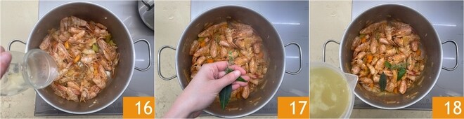 Gießen Sie dann auch den Weißwein hinzu 16 und lassen Sie den Alkohol einige Minuten vollständig verdampfen. Fügen Sie die aromatischen Kräuter hinzu 17 und geben Sie den Fischfond dazu 18.