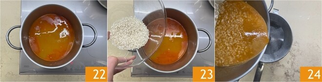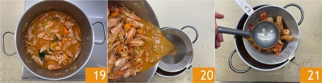 Stellen Sie es erneut auf die Hitze 22 und bringen Sie es zum Kochen. Geben Sie den Reis hinein 23 und kochen Sie ihn etwa 15 Minuten lang, gelegentlich umrühren. Auf diese Weise gibt der Reis seine gesamte Stärke in die Bisque ab. Filtern Sie die Bisque erneut mit einem feinen Chinois 24 in einen anderen kleinen Topf.