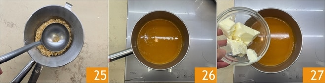 Drücken Sie gut mit der Rückseite eines Löffels 25 und stellen Sie die Bisque erneut auf die Hitze 26. Fügen Sie die restlichen 100 g Butter hinzu 27.