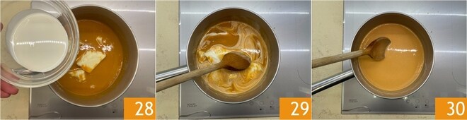 Fügen Sie auch die Sahne hinzu 28 und rühren Sie um 29, bis sie gut vermischt sind 30. Wenn nötig, mit Salz und Pfeffer abschmecken.