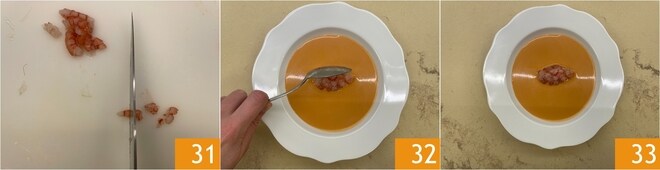 Schneiden Sie die Garnelen in kleine Stücke 31. Servieren Sie die Bisque, indem Sie eine Garnelen-Quenelle darauf geben 32 und genießen Sie sie heiß 33!