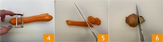 Schälen Sie die Karotte 4 und schneiden Sie sie in die gleiche Größe wie den Sellerie 5. Schälen Sie auch die Zwiebel 6.