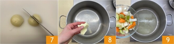 Schneiden Sie auch diese grob 7. Dann nehmen Sie einen großen Topf und geben Sie 20 g Butter hinein 8; lassen Sie sie schmelzen und fügen Sie auch das Soffritto-Gemüse hinzu 9.