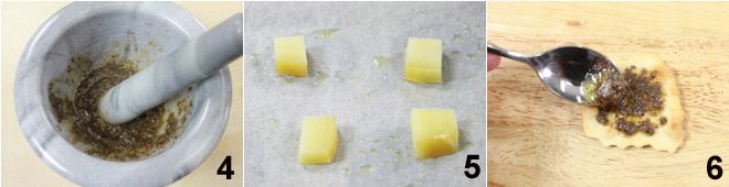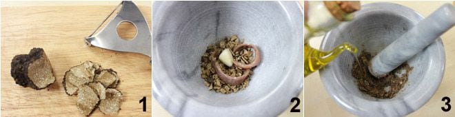 Beginnen Sie mit der Zubereitung der Trüffelcreme: Hacken Sie den Trüffel mit einem Messer, wobei Sie darauf achten, einige kleine Scheiben für die abschließende Dekoration aufzuheben 1. Geben Sie ihn in einen Mörser und fügen Sie die halbe Knoblauchzehe und die 2 Anchovisfilets hinzu 2, beginnen Sie dann, die Zutaten zu zerstoßen. Fügen Sie dann das Olivenöl extra vergine hinzu 3