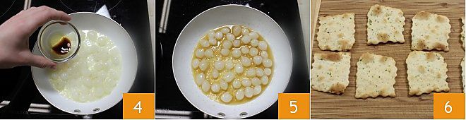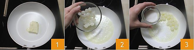 Um die Blätterteige mit Oliven und karamellisierten Zwiebeln zuzubereiten, beginnen Sie mit dem Karamellisieren der kleinen Zwiebeln: In einer Pfanne bei niedriger Hitze die Butter schmelzen 1, die kleinen Zwiebeln hinzufügen und sie für einige Minuten goldbraun anbraten 2, dann den Kristallzucker hinzufügen 3. Hin und wieder mit einem Holzlöffel umrühren und darauf achten, dass der Zucker nicht am Boden der Pfanne kleben bleibt;
