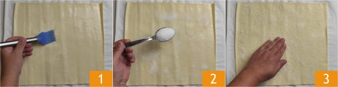 Um die Blätterteig-Fächer zuzubereiten, rollen Sie als erstes den ersten Blätterteig mit dem Backpapier aus und bestreichen ihn mit Wasser 1. Verteilen Sie 20 g Zucker gleichmäßig auf der gesamten Oberfläche 2; drücken Sie mit den Händen, damit der Zucker gut haftet 3.