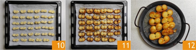 Legen Sie die Blätterteig-Fächer ordentlich auf das Backblech 10, mit etwas Abstand zueinander, und backen Sie sie im Umluftofen bei 180 °C für 15 Minuten oder bis die Oberfläche goldbraun ist 11. Ihre Blätterteig-Fächer sind bereit zum Servieren 12!