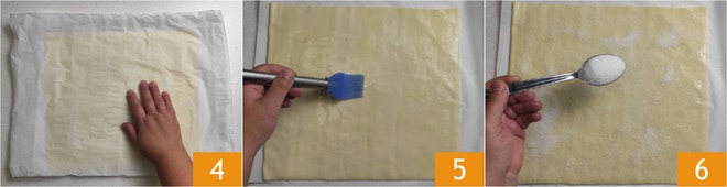 Bedecken Sie den Blätterteig mit einem weiteren Blatt Backpapier 4 und wenden ihn. Bestreichen Sie erneut mit Wasser 5 und verteilen weitere 20 g Zucker auf der Oberfläche 6.