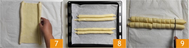Rollen Sie den Blätterteig von den kurzen Seiten zur Mitte hin auf 7, sodass Sie zwei gleich geformte und gleich dicke Rollen erhalten. Wiederholen Sie die Schritte zum Zuckern und Aufrollen mit dem zweiten Blätterteig. Legen Sie sie auf ein mit Backpapier ausgelegtes Backblech 8 und lassen sie 30 Minuten im Kühlschrank ruhen. Schneiden Sie danach Scheiben von etwa 1 cm Dicke 9.