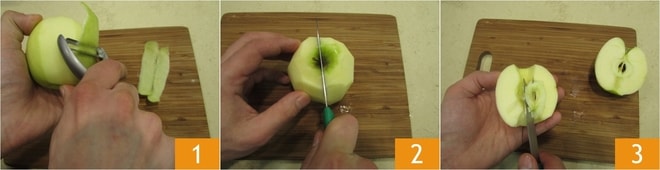Um die Apfel-Blätterteigtaschen vorzubereiten, können Sie die Äpfel schälen 1 oder waschen, um sie mit Schale zu verwenden. Schneiden Sie sie in der Mitte durch 2, entfernen Sie das Kerngehäuse, indem Sie mit einem Messer ein tiefes Loch machen 3 und mit einem Teelöffel aushöhlen.