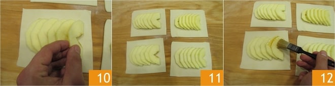 Legen Sie auf jedes Blätterteigstück 6-7 Apfelscheiben und überlappen Sie sie leicht, wobei Sie rundherum 1-1,5 cm Abstand zum Rand lassen 10. Wenn Sie fertig sind 11, bestreichen Sie die Äpfel mit der Hälfte der Pfirsichmarmelade 12.
