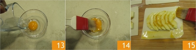 Schlagen Sie in einer separaten Schüssel das Eigelb mit wenig Wasser auf (13-14) und bestreichen Sie den Rand des Blätterteigs 15.