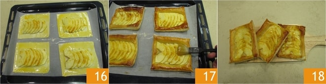 Legen Sie die vorbereiteten Blätterteigtaschen auf ein mit Backpapier ausgelegtes Backblech 16 und backen Sie sie im vorgeheizten statischen Ofen bei 180°C-190°C für 10-12 Minuten (oder bei 160°C-180°C für 7-8 Minuten, wenn Sie einen Umluftofen verwenden). Wenn sie gebacken sind, nehmen Sie sie aus dem Ofen, bestreichen Sie sie mit der restlichen Pfirsichmarmelade 17 und lassen Sie sie abkühlen. Schließlich können Sie Ihre Apfel-Blätterteigtaschen servieren und genießen 18.