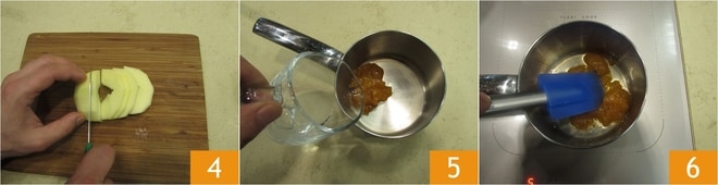 Schneiden Sie sie dann in sehr dünne Scheiben mit einer Dicke von 4 mm 4. Um zu vermeiden, dass die Äpfel braun werden, legen Sie sie in eine Schüssel mit kaltem Wasser und dem Saft einer halben Zitrone. Geben Sie die Pfirsichmarmelade in einen Topf, fügen Sie das Wasser hinzu 5 und bringen Sie es bei mittlerer Hitze zum Kochen, indem Sie 2 Minuten lang mit einem Küchenspatel umrühren 6.