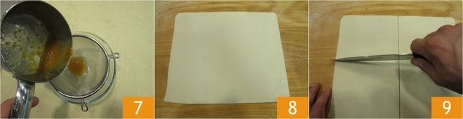 Schalten Sie die Hitze aus und passieren Sie die entstandene Mischung mit einem feinmaschigen Sieb, um die Marmelade cremiger zu machen 7. Rollen Sie den Blätterteig auf der Arbeitsfläche aus 8 und schneiden Sie ihn in 4 Rechtecke der Größe 10x15 cm 9.