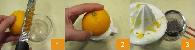 Um die Blätterteig-Apfeltörtchen zuzubereiten, beginnen Sie damit, die Schale einer Orange abzureiben 1 und beiseite zu legen; dann pressen Sie den Saft aus 2 und geben ihn über die in einer kleinen Schüssel gesammelten Rosinen (bereits unter fließendem Wasser abgespült), indem Sie ihn durch ein Sieb gießen 3.