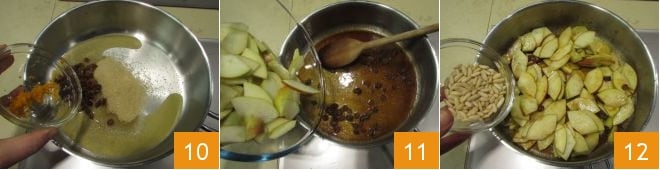Würzen Sie mit der zuvor abgeriebenen Orangenschale 10 und dem Zimtpulver, geben Sie die Apfelscheiben 11 und die Pinienkerne hinzu 12, und lassen Sie alles einige Minuten auf mittlerer Hitze unter gelegentlichem Rühren anbraten.