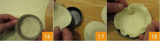 Schneiden Sie 7 Kreise mit einem gezahnten Ausstecher von 11 cm Durchmesser aus 16. Nehmen Sie Tortelettformen mit einem Durchmesser von 8,5 cm und einem Rand von 2 cm, legen Sie die Blätterteigkreise in jede Form (17-18) und drücken Sie sie gut auf den Boden und den Rand.