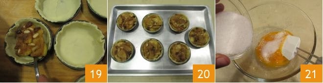 Füllen Sie die Törtchen mit der inzwischen abgekühlten Apfelfüllung 19, legen Sie sie auf ein Backblech 20 und backen Sie sie 25 Minuten lang im vorgeheizten statischen Ofen bei 180°. Inzwischen kümmern Sie sich um die englische Creme, die Ihre Törtchen begleiten wird: Geben Sie den Zucker in die Schüssel mit den Eigelben und mischen Sie mit einem Spatel 21,