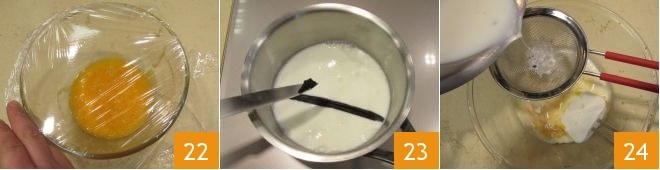 decken Sie sie mit Frischhaltefolie ab 22 und lassen Sie sie bei Raumtemperatur stehen, dann schneiden Sie die Vanilleschote der Länge nach auf und kratzen Sie die inneren Samen mit dem Rücken der Klinge aus. Geben Sie in einen kleinen Topf die Milch und fügen die Samen zusammen mit der aufgeschnittenen Schote hinzu 23, schalten Sie die Flamme ein und erhitzen Sie, bis sie fast kocht. Wenn die Milch heiß ist, gießen Sie sie durch ein Sieb in die Schüssel mit der Eier-Zucker-Mischung 24,
