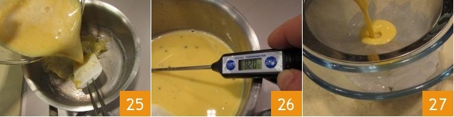 rühren Sie gut um und geben Sie dann alles zurück in den Topf 25. Kochen Sie die Creme bei schwacher Hitze und rühren Sie ständig um, bis sie auf 82° erhitzt wird 26 (um die Temperatur sicherzustellen, ist die Verwendung eines Küchenthermometers unerlässlich) und filtern Sie schließlich, wenn die Creme fertig ist, die Mischung in eine Schüssel, die auf einer anderen Schüssel mit Eis steht 27;