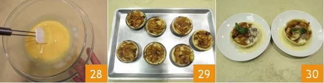 Rühren Sie mit einem Spatel bis zur vollständigen Abkühlung 28: dieser Schritt hilft, die Temperatur der Creme schnell zu senken, ohne ihren Geschmack, ihre Farbe und Konsistenz zu verlieren. Nach dem Backen die Blätterteig-Apfeltörtchen aus dem Ofen nehmen 29 und mit der inzwischen kalten englischen Creme und einigen frischen Minzblättern 30 servieren!
