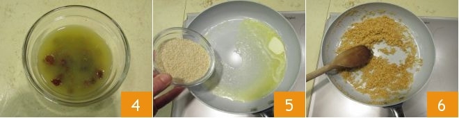 Lassen Sie die Rosinen im Orangensaft einweichen 4, während Sie mit der Zubereitung fortfahren. Geben Sie in eine Pfanne die Butter und lassen Sie sie bei sehr niedriger Hitze schmelzen; sobald sie geschmolzen ist, fügen Sie die Semmelbrösel hinzu 5 und rösten Sie sie einige Minuten lang, indem Sie häufig mit einem Holzlöffel umrühren. Danach schalten Sie das Feuer aus und stellen sie beiseite 6.