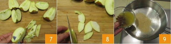 Waschen und trocknen Sie die Äpfel, schneiden Sie sie in Viertel und entfernen Sie das Kerngehäuse 7, dann schneiden Sie aus jedem Viertel ohne sie zu schälen Scheiben von etwa 4 mm Dicke in der Breite 8. In eine andere Pfanne mit hohem Rand geben Sie den Zucker und fügen die Rosinen mit dem gesamten Einweichsaft hinzu 9.